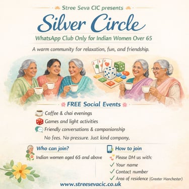 We invite Indian women over 65 years of age to join Silver Circle Club of Stree Seva CIC to enjoy free or heavily subsidised events, get togethers and coffee evenings! Add your parents, in-laws and also visiting parents so that they feel connected and find friends locally.